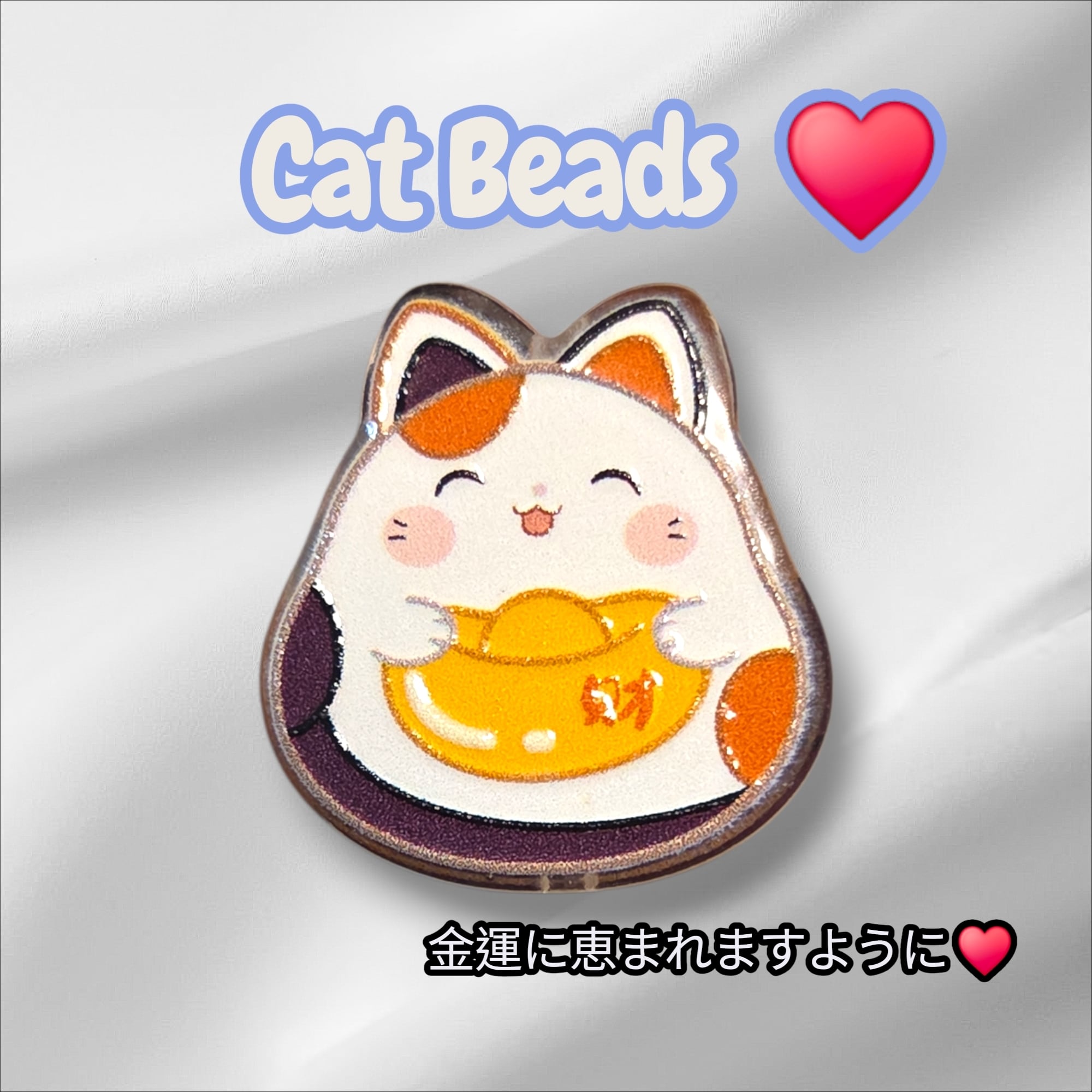 「財」の文字が描かれた、縁起の良いネコビーズ。
